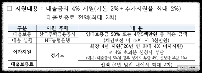 2026년 경기도 저소득층 전세금 대출보증 및 이자지원 사업 정보를 정리했습니다. 최대 4,500만 원 한도 내에서 연 4%의 이자를 지원받는 조건과 신청 경로를 확인해보세요.