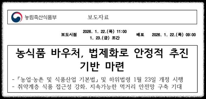2026년 1월 23일부터 「농업·농촌 및 식품산업 기본법」 개정안이 적용되면서 농식품 바우처는 법적 근거를 갖춘 국가 제도로 자리 잡았습니다.